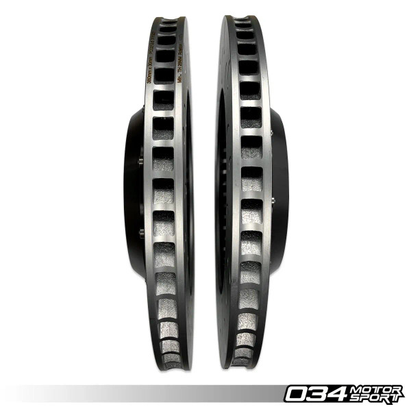 The central hat portion of the 034Motorsport rotor is made of 6061-T6 aircraft specification aluminum. The disc is constructed out of a proprietary metal alloy that can withstand immense braking temperatures while holding form. The rotor utilizes 72 directionally curved vanes to forcefully flow cool air through the rotor to dissipate heat.