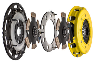 T2R-F06 race, twin disc kit offers twice the number of disc surfaces for better wear, heat capacity and long life compared to single disc kits. These kits use a proprietary Positive Lift Floater System design, which results in quiet operation with no floater rattle and no posts to wear. ACT twin disc kits undergo an exclusive four-stage, heat-treating process on all diaphragms. The ACT twin disc features the ability to adjust for disc wear and provides equal disengagement for discs. ACT's 6-pad rigid race discs are made with high quality, ceramic friction materials. The chrome-moly hub is heat-treated for strength and durability. The lightweight, rigid design allows for quicker shifts and trouble-free service. All ACT twin disc kits include a CNC-machined and dynamically balanced flywheel to ensure trouble-free installation and operation. ACT twin disc kits include a pressure plate, two discs, a floater, flywheel and alignment tool. Some kits may include a pilot bearing and release bearing.