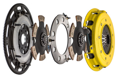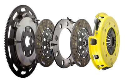 T2R-F08 race, twin disc kit offers twice the number of disc surfaces for better wear, heat capacity and long life compared to single disc kits. These kits use a proprietary Positive Lift Floater System design, which results in quiet operation with no floater rattle and no posts to wear. ACT twin disc kits undergo an exclusive four-stage, heat-treating process on all diaphragms. The ACT twin disc features the ability to adjust for disc wear and provides equal disengagement for discs. ACT's 6-pad rigid race discs are made with high quality, ceramic friction materials. The chrome-moly hub is heat-treated for strength and durability. The lightweight, rigid design allows for quicker shifts and trouble-free service. All ACT twin disc kits include a CNC-machined and dynamically balanced flywheel to ensure trouble-free installation and operation. ACT twin disc kits include a pressure plate, two discs, a floater, flywheel and alignment tool. Some kits may include a pilot bearing and release bearing.