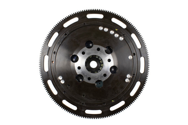 T1R-F09 twin disc kit offers twice the number of disc surfaces for better wear, heat capacity and long life compared to single disc kits. These kits use a proprietary Positive Lift Floater System design, which results in quiet operation with no floater rattle and no posts to wear. ACT twin disc kits endure an exclusive four-stage, heat treating process performed on all diaphragms. The ACT twin disc features the ability to adjust for disc wear and provides equal disengagement for discs. ACT's 6-pad rigid race discs are made with high quality, ceramic friction materials. The chrome-moly hub is heat-treated for strength and durability. The lightweight, rigid design allows for quicker shifts and trouble-free service. All ACT twin disc kits include a CNC-machined and dynamically balanced flywheel to ensure trouble-free installation and operation. ACT twin disc kits include a pressure plate, two discs, a floater, flywheel and alignment tool. Some kits may include a pilot bearing and release bearing.