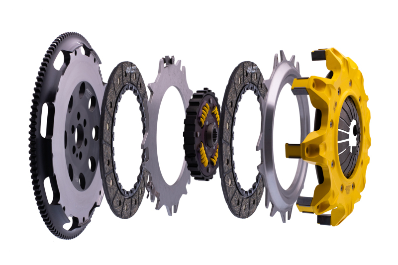 T1SS-N06 Mod-Twin 225 HD Sprung Street Kit is designed for high powered AWD street cars. It unites uncompromised pedal feel, durability, engagement quality with very high torque capacity by combining twice the organic friction surfaces with an ultra-durable spring center Mono-Drive hub in a completely modular design. Each diaphragm spring endures an exclusive four-stage heat treating process providing a consistent light pedal feel. Steel-backed Friction Plates with high quality organic friction materials deliver stable friction coefficient, good heat capacity and long clutch life. These Friction Plates uniformly transfer torque to the Mono-Drive sprung hub assembly which extends input shaft life and reduces driveline shock from torsional vibration. This kit includes a CNC-machined and dynamically balanced flywheel, pressure plate cover, diaphragm spring, face, puck-style ceramic friction plates, sprung Mono-Drive hub assembly, floater, patented Monoloc Collar, release bearing, alignment tool and pilot bearing (if needed). Mod-Twin clutches are fully rebuildable and most components can be ordered separately.