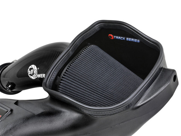 aFe POWER Track Series Intake Systems, the pinnacle of innovation in open-element intakes. Designed using cutting-edge tech and crafted with premium materials, they undergo rigorous testing to ensure peak performance. Showcasing a one-piece housing that shields from elements and heat, seamlessly fitting into the engine bay. The highlight of the Track Series is its carbon fiber intake tube, meticulously CAD-designed and refined through dyno-testing. The result is a visually striking, lightweight system that delivers exceptional performance and a captivating induction sound. This 9” tall 360-degree radial flow air filter features our pre-oiled Black Pro 5R media with five layers of progressively finer cotton gauze media for maximum performance. It provides your engine with the largest amount of high-flowing air and delivers the highest power gains in most cases. This media is perfect for street and/or track use. This Track Series air filter was specially designed for the Raptor R and features a carbon fiber top. Lightweight twill weave carbon fiber tube directs the filtered air from the massive air filter to the engine. It is computer designed and dyno tested to increase air flow while reducing weight and enhancing the visual appearance of the engine bay. The tube is manufactured out of 100% carbon fiber material (No fiberglass). The included massive air filter is surrounded by an open-element XLPE (cross-linked polyethylene) polymer housing that minimizes warm engine air for maximum performance. Its open design allows for easy viewing of the air filter and delivers an aggressive Air Intake sound. It utilizes the vehicle's factory air inlet. The built-in air intake scoop captures cold air directly from the top of the radiator support thanks to its huge opening. Its innovative design makes for a hassle-free, direct bolt-on installation process that requires no cutting or drilling.