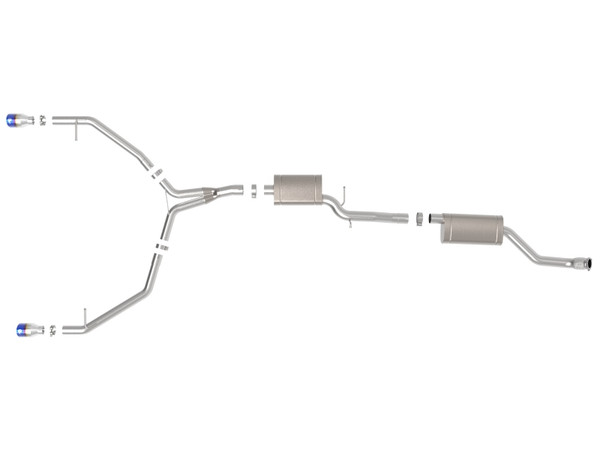 This cat-back exhaust system is constructed of 3 IN to 2-1/2 IN mandrel-bent 304 stainless steel tubing for maximum strength and durability. This system features high-flow stainless steel mufflers, producing a mild sound. Finishing off this exhaust system are dual 4 IN diameter blue flame 304 stainless steel clamp-on exhaust tips. The tips features a laser etched aFe POWER logo for a unique style. This system produces a mild sound unleashing all available horsepower and torque. Utilizing a factory style flange and hangers this system is a direct bolt-on system, which requires no cutting or modifications for a hassle-free installation. This cat-back exhaust system uses a heavy duty flex pipe with an internal interlock liner for added strength and durability. Utilizing state-of-the-art computer-aided design technology, this exhaust system is designed for custom, high tolerance factory fitment. 100% MIG-Welded for race-proven strength and durability.