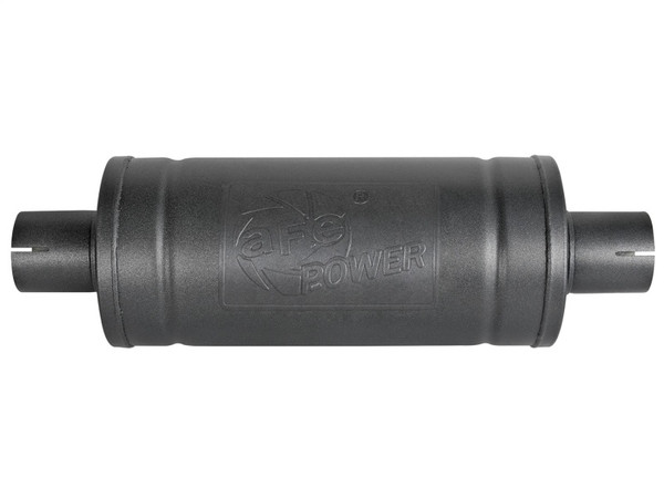 Wake up your stock exhaust or build your own custom exhaust with aFe POWER's high flow, stainless steel, universal fit MACH Force-Xp muffler. Designed to provide a deep, throaty, powerful sound on acceleration yet maintains a smooth sound at idle, this muffler is made of 409 stainless steel and uses a straight through perforated core with heat resistant packing to reduce backpressure and maximize exhaust flow to improve performance and sound. Finished with a corrosion resistant high temp metallic black powder-coat for long lasting good looks. Stainless Steel Construction: Constructed of 409 stainless steel for long lasting strength and durability. High-Temperature, Metallic Black Powder Coating: Helps prevent corrosion, deepen the exhaust tone and give it a custom look. Design and Sound: Designed for exhaust gasses to travel straight through the heat resistant perforated core for a remarkable tone. Universal Fit: Universal muffler fits 2-1/2" stainless steel tubing. Muffler comes slotted. Stamped with an aFe POWER logo: Features an aFe POWER logo stamped onto the muffler for quality, brand authenticity. Muffler Specifications: Configuration: 2-1/2" Center Inlet / 2-1/2" Center Outlet. Size: 14" body length x 6" diameter round body, slotted.