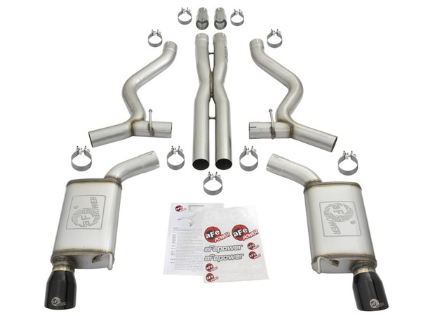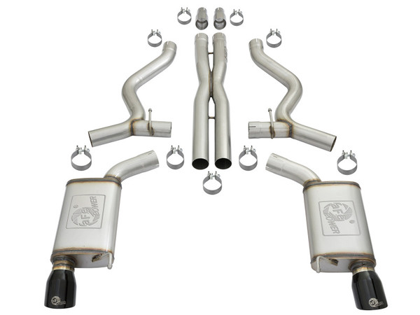 aFe is proud to introduce an all new Mach Force-Xp cat-back exhaust system. In testing, this system resulted in gains up to +11 HP and +14 lbs. x ft. of torque verified by our in house dyno (V8 Engine). This cat-back exhaust system utilizes full 3" tubing with reduction tubes to fit the OE connections. Remove them and combine with the aFe power Twisted Steel Long tube headers and connection pipes (P/N: 48-33012-YC) for added flow and performance. This system incorporates dual, high-flow mufflers to improve performance across the power band while maintaining an aggressive sound. aFe also added an X-pipe to balance and evenly distribute exhaust pulses traveling through the exhaust system, creating more efficient flow and better performance while minimizing exhaust drone resulting in an awesome sound. To finish off the exhaust, dual 4" high-luster polished 304 stainless steel tips are included. This is a direct bolt-on system no modifications necessary and includes all necessary hardware for a hassle-free installation. Aggressive Sound: Dual free-flowing mufflers are used to absorb high pitch tones producing a powerful sound and unleashing all available horsepower and torque. X-Pipe Balance Tube: The equalizer balance tube evenly distributes exhaust pulses traveling through the exhaust system. This creates a more efficient flow for better performance while minimizing exhaust drone. Simple Installation: This is a direct bolt-on system which retains your factory exhaust tips and includes all necessary hardware for a hassle-free installation. No modifications necessary. Leak-Free Seal: High quality band clamps are used for a complete 360 degree sealing surface. Dual 304 SS Tips: Finishing off this unique exhaust system are dual, aFe laser etched, 4" gloss black 304 stainless steel tips for an aggressive style. Removable Reduction Pipes: They can be removed to combine with the aFe Twisted Steel long tube headers for increased flow and performance (P/N: 48-33012-YC).