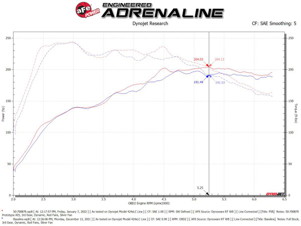 This aFe POWER Pro 5R air filter is a 7-1/2” tall, pre-oiled, 360-degree radial flow performance air filter with five layers of progressively finer cotton gauze media for maximum performance. It provides your engine with the largest amount of high-flowing air, usually resulting in the highest power gains out of all our filter media options. This media is perfect for street and/or track use. The sealed XLPE polymer housing features a rugged design, as well as a clear sight window, allowing for hassle-free filter inspection. aFe POWER's patent pending filter-to-housing interface eliminates the use of an overabundance of parts, further simplifying the installation process. The housing utilizes the factory air inlet, using no additional hardware, and features an optional auxiliary air inlet that pulls in additional air. This system features a high quality, computer-designed, dyno-tuned intake tube to achieve maximum power gains while maintaining a perfect fit. Its XLPE material is heat soak resistant and extremely durable. The computer designed system utilizes factory mounting locations, minimizing the use of unnecessary hardware and ensuring a perfect fit every time. Its innovative design makes for a hassle-free, direct bolt-on installation process that requires no cutting or drilling. Its revolutionary design, featuring our patent pending filter-to-housing interface, uses half the number of parts of a traditional cold air intake system.