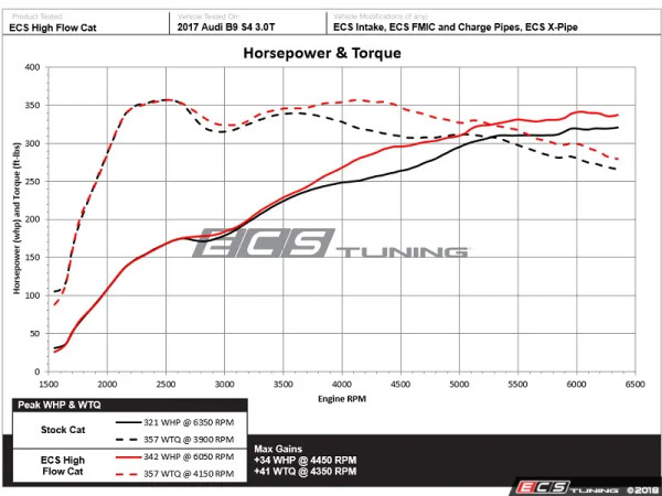 The perfect way to unleash hidden horsepower in a modern turbocharged engine is to upgrade the restrictive factory catalytic converter with a smoother, higher flowing unit. This is a great way to increase performance and add a nice growl to the exhaust note. Ideal performance is achieved through expelling exhaust gasses at maximum velocity through a less-restrictive catalytic converter. We measured maximum gains of +34WHP and +41ft/lbs of torque on our Audi B9 S4 with a stock tune when equipped with an ECS Kohlefaser Luft-Technik Intake System, ECS X-Pipe, and ECS Intercooler/Charge Pipe Kit.