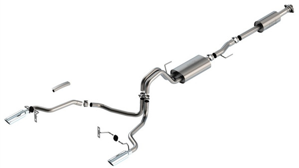 This 3" into dual 2.25" diameter Borla(r) Cat-Back(tm) system was specifically designed to enhance the power and sound of the Ford F-150 equipped with the 5.0L V8 engine. The split rear exit configuration replaces the single factory tail pipe, and has single 4" round bright chrome on T-304 stainless steel tips on each tail pipe. A system with black chrome on T-304 stainless steel tips is also available. This system features the mellow Touring sound that gives you a mild sound of power with no drone. Additional systems are available with different options for sound level, tip finish and tip exits. Add adapter 60556 for Crew Cab with Standard Bed (6' 7") 157.2" Wheelbase vehicles. Add adapter 60564 for Extended Cab with Long Bed (8' 2") 164.1" Wheelbase vehicles. Borla(r) Cat-Back(tm) & Axle-Back exhaust systems feature patented straight-through and multi-core technology to unleash hidden horsepower. Increased exhaust velocity adds power, driving excitement, fuel economy, and the distinctive Borla(r) Sound of Power respected by motoring enthusiasts everywhere. Each system is built from premium, high-quality T-304 austenitic stainless steel, superior to T-400 series knockoffs (such as 409), to give you the absolute best in performance and durability. Ultra-smooth mandrel bends ensure maximum flow & power, and precision computer numerical control (CNC) manufacturing ensures an accurate fit. All this is backed by our unsurpassed Million Mile Warranty. System Features: Cat-Back(tm) System Split Rear Exit 4" Round Bright Chrome On T-304 Stainless Steel Tips Touring Sound Level T-304 Stainless Steel Construction Bolt-On Installation Million Mile Warranty