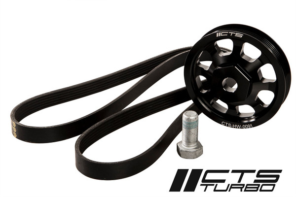 The CTS Turbo crank pulley is lightened to reduce parasitic drag on the engine. This results in faster revving and more horsepower. Included in the kit is the lightened crank pulley, replacement bolt and a shorter belt. The pulley is made from T6 6061 aircraft grade aluminum and hard anodized to reduce wear. Gains of 5-7 horsepower can be expected. Designed and made in Canada!