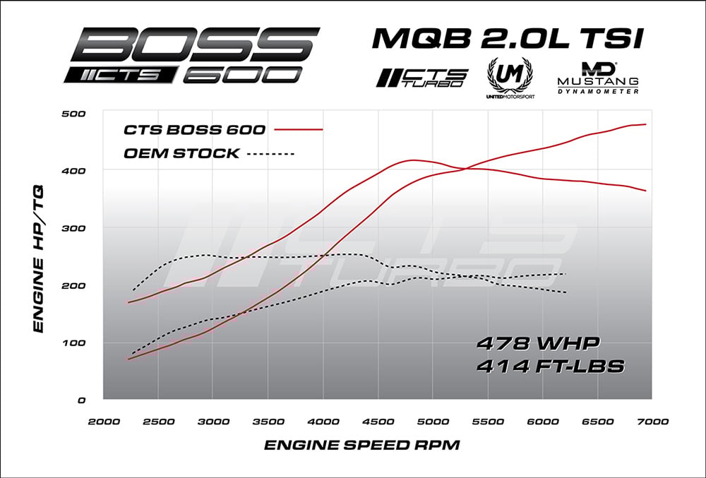 CTS Turbo is proud to introduce the world's first truly bolt-on turbo upgrade for MQB vehicles. After a long and tedious R&D process, our engineers have finalized this turbo upgrade kit to create a modular package that is capable of producing upwards of 600hp and has the long-term reliability of a genuine Garrett Gen2 GTX turbocharger. At the heart of our aptly named BOSS (Bolt-On Speed Solution) MQB upgrade kit is a Garrett Gen2 GTX turbocharger, it is installed into a CTS proprietary exhaust housing. The housing is carefully cast and machined to be compatible with any exhaust downpipe and the scroll area was designed to be approximately 0.63AR. This results in very good boost response and eliminates any possible restriction. Don't be fooled by other manufacturers putting a larger turbo into a stock housing. It is not beneficial, that is why we made our own! Custom wastegate solenoid bracket and oil/water lines complete this kit to offer simple installation, simple tuning, and problem-free operation. Proprietary custom molded silicon hoses connect the turbo to your turbo outlet pipe and air intake. Currently the BOSS turbo upgrade is only compatible with CTS Turbo intake, however, other intakes could be made to work - unfortunately, we cannot provide guidance for installing other manufacturer's intakes. You can use a CTS Turbo or other billet diverter/blow-off valve. Factory DV is compatible but requires a harness extension. Only OEM or CTS turbo outlet pipe is compatible at this time. Product contents: - Genuine Garrett GTX Gen2 turbocharger - CTS Turbo exhaust housing - CTS Turbo wastegate bracket - CTS Turbo 4-ply silicon couplers - CTS Turbo DV/BOV valve adapter - CTS Turbo oil lines - CTS Turbo water lines - Hardware required for installation  Product features: - 400hp to 600hp capable (depending on fueling and engine mods) - Direct bolt-on without any modifications to the car - Compatible with CTS Turbo intake and DV/BOV - Compatible with factory or CTS Turbo turbo outlet pipe - Compatible with any exhaust downpipe - Tuning available for North American fueling and for upgraded fueling from United Motorsport and Eurodyne