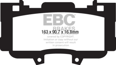 There are TWO reasons our customers love Redstuff, First because they are the lowest dust pad we have encountered by reducing dust by 60-90-percent. Plus the minimal dust you see is very easily removed with a simple sponge wash as it contains no steel fibre particles as in ALL OTHER pads. Second they brake like an alligator right from cold (as good as Original pads or better) and just get better as they heat up.This material is a Synthetic Fiber based brake compound enhanced with ceramic particles. If you have previously tried EBC redstuff (pre-ceramic compound) this material is light years ahead. It lasts longer; it brakes better and is quieter. Being a hard wearing pad, bed-in times can be as long as 1000 miles and drivers must be patient until the pad takes up the shape of their disc (brake rotor). This is a truly impressive fast road pad for repeated heavy braking.It emits far less dust than semi-metallic pads and has been proven to stop a passenger car/sedan/sport compact/hot hatch 13 metres quicker than OEM pads from 100mph/160kph. Features EBC Brake-In surface coating which conditions rotor surface and accelerates pad bed-in. Nominal friction coefficient 0.5 with approx. 50-percent dust reduction.Most EBC Red Ceramic pads are approved to ECE R90 brake safety regulation.