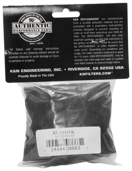 The K&N Drycharger is a silicone treated, polyester wrap that is made to cover K&N Air Filters or Personal Watercraft Flame Arrestors. These Drychargers, which are similar to the K&N Prechargers, contain uniform micron sized openings that allow high air flow. Yet, due to the Drychargers silicone treated polyester wrap, the amount of water that reaches the air filter or flame arrestor is limited.