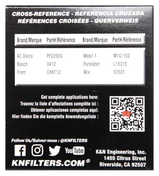 K&N Cartridge Oil Filters are designed to satisfy the needs of racers and engine builders as well as the average vehicle owner who wants the best oil filter available. K&N cartridge oil filters trap harmful contaminants while the filter's construction allows for high oil flow rates. All K&N oil filters are manufactured to meet stringent engineering standards. They are covered by a limited warranty to be free from defects in materials and workmanship when installed and replaced using engine and equipment manufacturer's recommended service intervals.