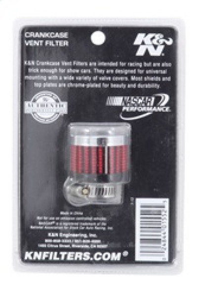 K&N crankcase vent filters are perfect for racing applications, vintage cars or individuals who want to add some aesthetics to their classic carbureted engine. The 62-2470 crankcase vent filter has a K&N embossed chrome top and chrome base. The 9/16 inch flange is designed to clamp on to the existing rubber breather grommets. Constructed with a synthetic filter media it can be cleaned and reused repeatedly. A pillow pack of K&N air filter oil is included. Note: Legal in California only for racing vehicles which may never be used, registered, or licensed for use upon a highway. See knfilters.com for CARB status on each part for a specific vehicle.
