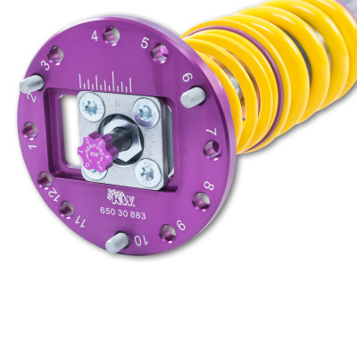 KW V2 INOX-LINE coilovers are the perfect solution for drivers who want more than just outstanding looks and adjustable ride height. In addition to stainless steel coilover struts, and corrosion-resistant components built for long term durability, KW V2 coilovers utilize TVR-A (Twin Valve Rebound - Adjustable) technology that allow Adjustment of the rebound damping characteristics with 16 clicks so you can fine tune the ride comfort or performance to your satisfaction. As with all KW coilovers our engineers develop vehicle specific damper settings that undergo comprehensive testing on the Nurburgring Nordschleife and in our KW 7-post Driving Dynamic Test Center. With a KW coilover kit the driving experience is more dynamic and direct. With the rebound adjustability you have a more direct influence on the handling or comfort of the car. With 16 precise clicks you can adjust the KW dampers (more firm or more comfortable) without affecting the compression damping fine-tuned by our engineers. The two-stage, patented TVR-A (Twin Valve Rebound - Adjustable) technology enables a small volume of oil flow through an adjustable, conically shaped, low-speed bypass during low damper speeds, while at high damper speeds, the main rebound stage valve opens allowing a larger volume of oil to flow. This provides a big improvement in terms of ride comfort without influencing the high-speed range. There are 16 precise clicks available for individual settings, so you can choose between more comfort or more body control. With KW V2 coilovers you can achieve maximum lowering within an approved lowering range that ensures a proper functioning suspension and adequate travel after your car is lowered. Even after years of use you can easily adjust the ride height thanks to the dirt resistant trapezoid thread and composite adjustment collar.