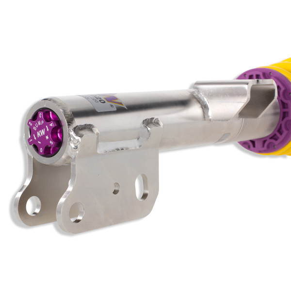 Cutting-edge motorsports technology for more performance on the road. Like every suspension product developed by KW automotive, the suspension manufacturer, and manufactured in Germany, the KW V3 Coilover suspension kit also provides a significant plus in safety reserves in road traffic. Thanks to the chassis with its high-quality dampers, springs, and elastomer spring elements, pitching and rolling movements during load changes such as evasive maneuvers, cornering, acceleration, and braking are significantly reduced. The braking distances are also shortened. Thanks to improved support and feedback, drivers not only feel safer but driving in everyday life becomes even safer. With compression and rebound stage damping, that can be set separately and independently of each other, the damper setup can be customized to your personal driving preferences or vehicle changes such as weight, tire characteristics, or altered vehicle rigidity. True performance optimization is only possible with this unique, patented system. For example, this allows the compression damping force to be increased and get more grip from the tires, to improve cornering behavior and reduce squat without simultaneously altering the rebound stage damping which is optimally matched to the spring rate, a scenario which results in reduced grip and the associated loss of performance. The KW V3 coilover kit is the ideal tool for performance-oriented drivers and experienced tuning enthusiasts who place a strong emphasis on the overall performance of their suspension. The Variant 3 features patented TVR-A and TVC-A technology that provides separately adjustable rebound and compression damping. The extensive adjustment range of the independently configurable rebound and compression make it easy to directly influence the steering behavior, directional stability, grip and handling characteristics for confident and repeatable results at the limit of drivin g dynamics.