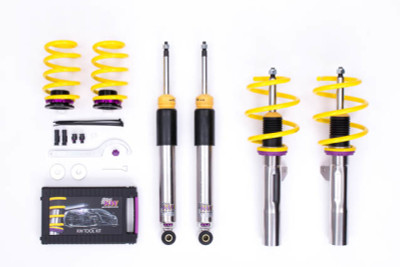 Cutting-edge motorsports technology for more performance on the road. Like every suspension product developed by KW automotive, the suspension manufacturer, and manufactured in Germany, the KW V3 Coilover suspension kit also provides a significant plus in safety reserves in road traffic. Thanks to the chassis with its high-quality dampers, springs, and elastomer spring elements, pitching and rolling movements during load changes such as evasive maneuvers, cornering, acceleration, and braking are significantly reduced. The braking distances are also shortened. Thanks to improved support and feedback, drivers not only feel safer but driving in everyday life becomes even safer. With compression and rebound stage damping, that can be set separately and independently of each other, the damper setup can be customized to your personal driving preferences or vehicle changes such as weight, tire charact eristics, or altered vehicle rigidity. True performance optimization is only possible with this unique, patented system. For example, this allows the compression damping force to be increased and get more grip from the tires, to improve cornering behavior and reduce squat without simultaneously altering the rebound stage damping which is optimally matched to the spring rate, a scenario which results in reduced grip and the associated loss of performance. The KW V3 coilover kit is the ideal tool for performance-oriented drivers and experienced tuning enthusiasts who place a strong emphasis on the overall performance of their suspension. The Variant 3 features patented TVR-A and TVC-A technology that provides separately adjustable rebound and compression damping. The extensive adjustment range of the independently configurable rebound and compression make it easy to directly influence the steering behavior, directional stability, grip and handling characteristics for confident and repeatable results at the limit of driving dynamics.
