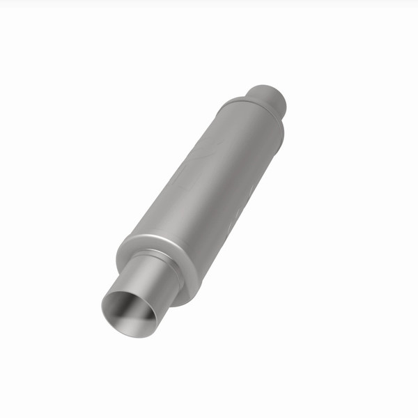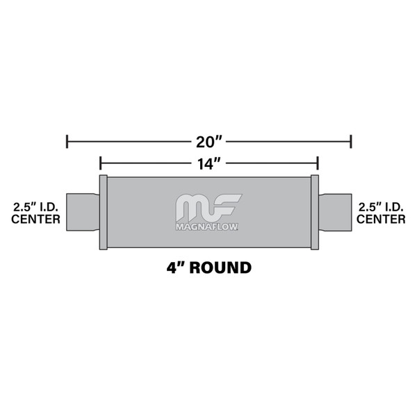 The MagnaFlow 4in. Round Straight-Through Performance Exhaust Muffler 10416 brings our world-famous exhaust sound and dyno-proven performance to your ride in a weight-optimized 4x4x14in. package with a premium satin finish. The straight-through free-flowing design of this round-bodied muffler's reversible, universal 2.5/2.5in. diameter inlet/outlet layout enables versatile installation options to match the spacing requirements of your vehicle. Due to the cutting and welding involved, professional installation is highly recommended. Internally, 10416 utilizes a perforated stainless steel core wrapped in stainless steel mesh and acoustic fiber fill to achieve a powerful, resonant tone. This muffler is made of durable, corrosion resistant stainless steel and produced using cutting-edge CNC precision robotic manufacturing techniques, all backed by MagnaFlow's limited lifetime construction warranty.