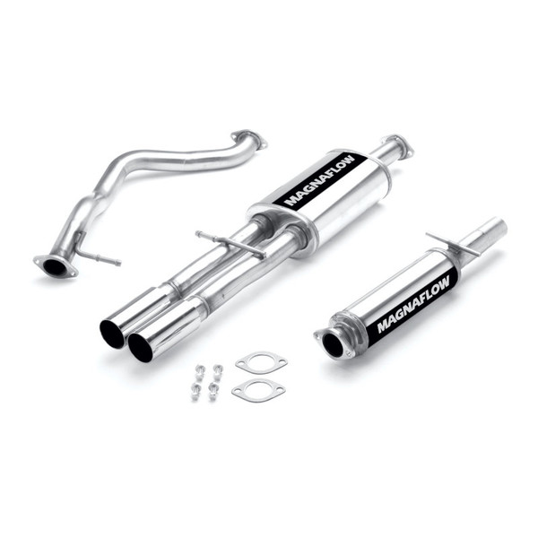 The MagnaFlow 2002-2005 Volkswagen Jetta Touring Series Cat-Back Performance Exhaust System 15746 is the perfect partner for your 1.8L, 2.8L 2002-2005 Volkswagen Jetta to take on a grand tour or a weekend cruise thanks to the powerful, resonant exhaust note and dyno-proven performance it brings to the table. This durable, corrosion resistant stainless steel exhaust kit is engineered to conquer the miles with ease while enhancing your driving experience with Moderate exterior and Mild interior sound levels generated through its fast-flowing, mandrel bent 2.25in. main piping and 2 Straight-Through muffler that terminate in a Dual Straight Driver Side Rear exit with 3in. Polished Welded-On Double Wall Straight Cut Rolled Edge tips. 15746 features a cat-back layout design to replace your import's stock exhaust components from the catalytic converter on back. This Volkswagen Jetta exhaust system is compatible with 2002-2005 engines. The use of extensive 3D scans made during the development process has resulted in an easy-to-install, direct-fit design that fits your Volkswagen Jetta like a glove. 15746 is produced using CNC precision robotic manufacturing techniques and is backed by MagnaFlow's limited lifetime construction warranty.