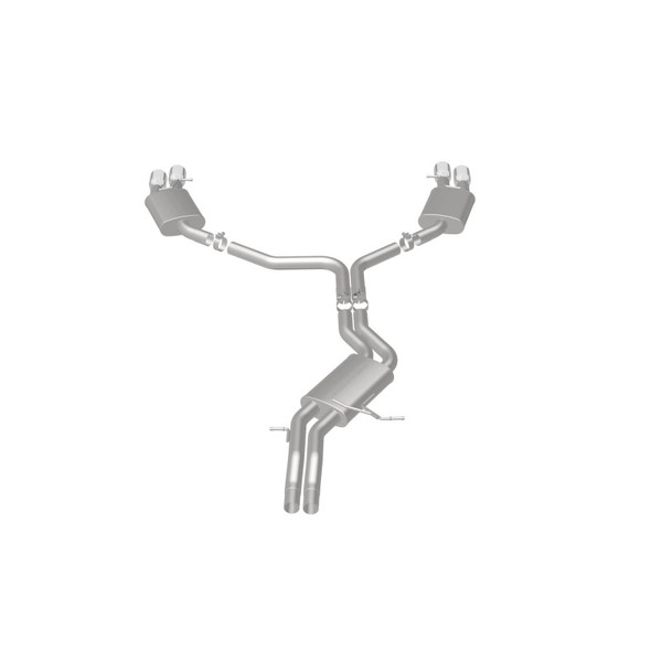 The MagnaFlow 2008-2012 Audi S5 Sport Series Cat-Back Performance Exhaust System 16598 enhances your 4.2L 2008-2012 Audi S5 with an aggressive character that is sure to help you stand out from the other Audi S5 you encounter on the street. With its 2.5in. diameter fast-flowing mandrel bent main piping that passes through 3 Straight-Through mufflers before ending in a Quad Split Rear exit with 3.5in. Polished Welded-On Double Wall Angle Cut Folded Edge tips, this dyno-proven Audi S5 exhaust system refuses to be ignored. As such, 16598 is tuned to produce our powerful, resonant signature exhaust note at Aggressive exterior and Moderate interior sound levels, so please check to ensure compliance with local noise regulations. The system's cat-back design replaces all your import's stock exhaust components from the catalytic converter on back. Extensive 3D scanning and CNC precision robotic manufacturing techniques are used to ensure that your exhaust system fits perfectly with just a simple do-it-yourself installation process. The durable, corrosion resistant stainless steel construction of 16598 is backed by MagnaFlow's limited lifetime warranty.