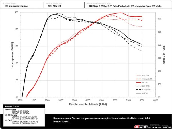 Dyno tested on our In-House Mustang Dyno on our shop 2015 MK7 GTI 2.0T 6 speed manual, comparing OEM GTI intercooler to ECS FMIC. Please see our documented results under the INSTALLATION Tab for more information.