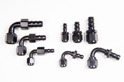 Reusable black anodized aluminum Push-Lok hose ends.