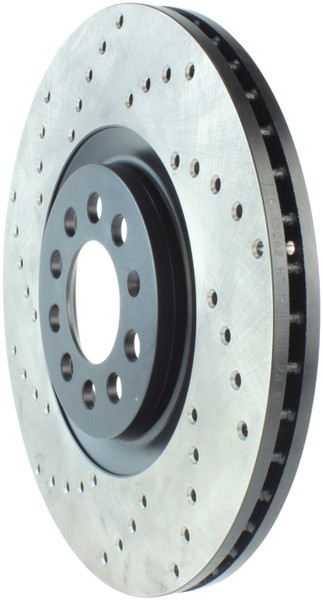 StopTech Drilled Sport Rotors are 1-piece direct replacement brake discs for factory brake systems and stock calipers that look great behind your wheels – and offer significantly improved braking performance. The unique cross-drilling aids with heat and brake dust dispersal; prevents glazing of the pads; adds bite and improves wet and dry braking performance. Built to last; the black e-coating provides protection from corrosion and the high carbon metallurgy (in most applications) offers quieter operation; better crack resistance and increased performance.