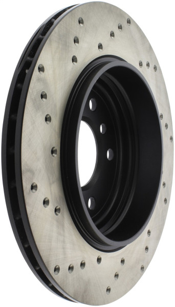 StopTech Drilled Sport Rotors are 1-piece direct replacement brake discs for factory brake systems and stock calipers that look great behind your wheels – and offer significantly improved braking performance. The unique cross-drilling aids with heat and brake dust dispersal; prevents glazing of the pads; adds bite and improves wet and dry braking performance. Built to last; the black e-coating provides protection from corrosion and the high carbon metallurgy (in most applications) offers quieter operation; better crack resistance and increased performance.