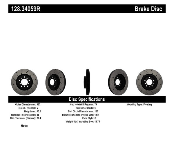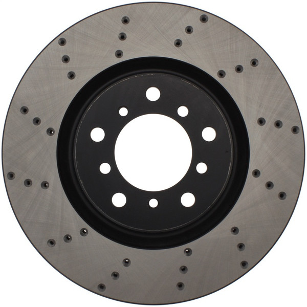 StopTech Drilled Sport Rotors are 1-piece direct replacement brake discs for factory brake systems and stock calipers that look great behind your wheels – and offer significantly improved braking performance. The unique cross-drilling aids with heat and brake dust dispersal; prevents glazing of the pads; adds bite and improves wet and dry braking performance. Built to last; the black e-coating provides protection from corrosion and the high carbon metallurgy (in most applications) offers quieter operation; better crack resistance and increased performance.