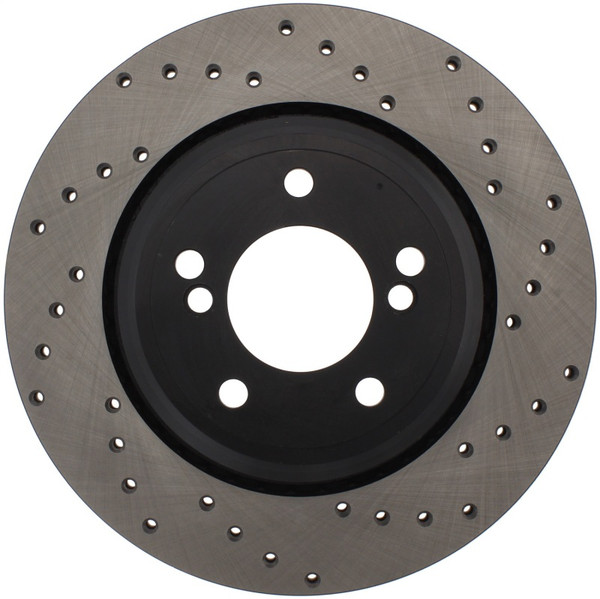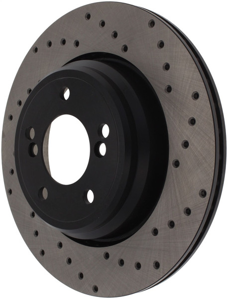 StopTech Drilled Sport Rotors are 1-piece direct replacement brake discs for factory brake systems and stock calipers that look great behind your wheels – and offer significantly improved braking performance. The unique cross-drilling aids with heat and brake dust dispersal; prevents glazing of the pads; adds bite and improves wet and dry braking performance. Built to last; the black e-coating provides protection from corrosion and the high carbon metallurgy (in most applications) offers quieter operation; better crack resistance and increased performance.