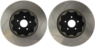 StopTech AeroRotor Replacement Kits ARK are designed to replace your vehicle's original factory rotors; while retaining the factory brake calipers. Although the ARK is the same diameter and thickness as the factory rotors; it offers improved cooling; braking; and handling. The directional; floating AeroRotors allow independent expansion of the rotor and hat without "coning;" thanks to elongated drive pin holes. ARK components include AeroRotor friction rings with patented internal vane design; pre-assembled to billet aluminum AeroHats with directional stand-offs that optimize cooling airflow. The patented AeroRotor vane design pushes up to 80 percent more air than factory rotors for better cooling and reduced fade on the track. The aircraft-grade aluminum hats and 2-piece AeroRotors are up to 8 pounds lighter than stock rotors; allowing faster acceleration and deceleration; and improved handling. StopTech AeroRotors are available slotted or cross-drilled. These slots or holes allow better dissipation of heat; friction material and debris; assuring that fresh pad material is in contact with the rotor every time the brakes are applied. An optional anti-corrosion; zinc finish is available for customers in cold climates; where salt and chemicals are used to melt snow and ice. The zinc coating also benefits customers who prefer no visible surface rust on the vanes and outer circumference of the rotors. StopTech AeroRotors are 100 percent made in the USA.