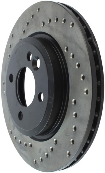 StopTech Drilled Sport Rotors are 1-piece direct replacement brake discs for factory brake systems and stock calipers that look great behind your wheels – and offer significantly improved braking performance. The unique cross-drilling aids with heat and brake dust dispersal; prevents glazing of the pads; adds bite and improves wet and dry braking performance. Built to last; the black e-coating provides protection from corrosion and the high carbon metallurgy (in most applications) offers quieter operation; better crack resistance and increased performance.