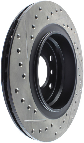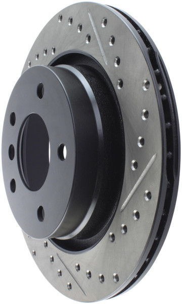 StopTech Drilled and Slotted Sport Rotors are 1-piece direct replacement brake discs for factory brake systems and stock calipers that look great behind your wheels – and offer significantly improved braking performance. The unique cross-drilling and slotting aids with heat and brake dust dispersal; prevents glazing of the pads; adds bite and improves wet and dry braking performance. Built to last; the black e-coating provides protection from corrosion and the high carbon metallurgy (in most applications) offers quieter operation; better crack resistance and increased performance.
