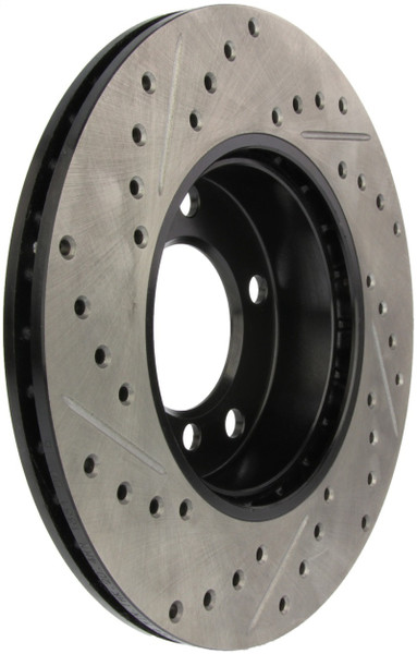StopTech Drilled and Slotted Sport Rotors are 1-piece direct replacement brake discs for factory brake systems and stock calipers that look great behind your wheels – and offer significantly improved braking performance. The unique cross-drilling and slotting aids with heat and brake dust dispersal; prevents glazing of the pads; adds bite and improves wet and dry braking performance. Built to last; the black e-coating provides protection from corrosion and the high carbon metallurgy (in most applications) offers quieter operation; better crack resistance and increased performance.