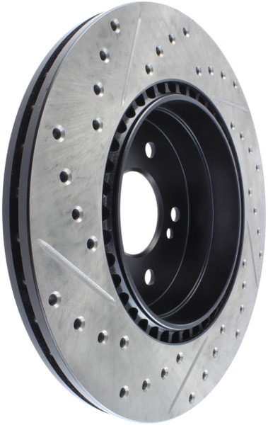 StopTech Drilled and Slotted Sport Rotors are 1-piece direct replacement brake discs for factory brake systems and stock calipers that look great behind your wheels – and offer significantly improved braking performance. The unique cross-drilling and slotting aids with heat and brake dust dispersal; prevents glazing of the pads; adds bite and improves wet and dry braking performance. Built to last; the black e-coating provides protection from corrosion and the high carbon metallurgy (in most applications) offers quieter operation; better crack resistance and increased performance.