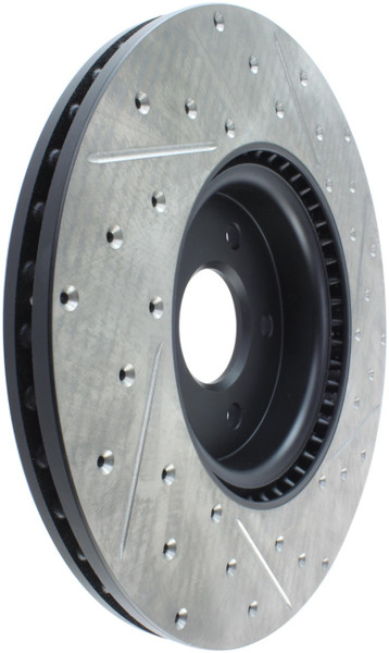 StopTech Drilled and Slotted Sport Rotors are 1-piece direct replacement brake discs for factory brake systems and stock calipers that look great behind your wheels – and offer significantly improved braking performance. The unique cross-drilling and slotting aids with heat and brake dust dispersal; prevents glazing of the pads; adds bite and improves wet and dry braking performance. Built to last; the black e-coating provides protection from corrosion and the high carbon metallurgy (in most applications) offers quieter operation; better crack resistance and increased performance.