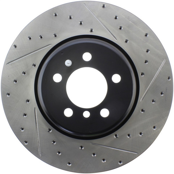 StopTech Drilled and Slotted Sport Rotors are 1-piece direct replacement brake discs for factory brake systems and stock calipers that look great behind your wheels – and offer significantly improved braking performance. The unique cross-drilling and slotting aids with heat and brake dust dispersal; prevents glazing of the pads; adds bite and improves wet and dry braking performance. Built to last; the black e-coating provides protection from corrosion and the high carbon metallurgy (in most applications) offers quieter operation; better crack resistance and increased performance.