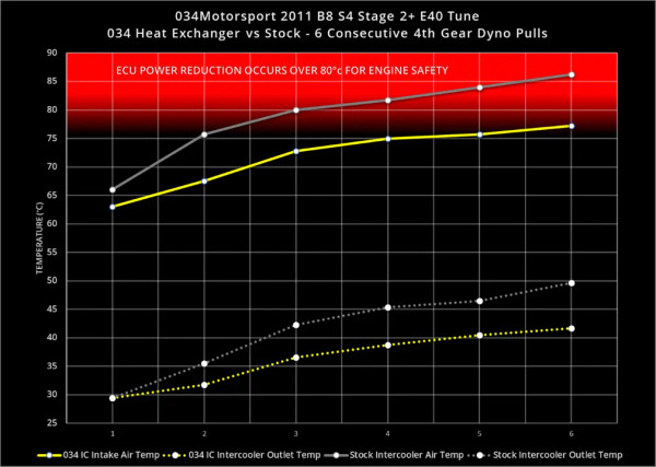 The dyno graph below shows the power output of the 3.0TFSI supercharged engine with the stock heat exchanger vs. the 034Motorsport Supercharger Heat Exchanger. The ECU reduces power when the intake air temperature exceeds 80C. Over successive pulls, the stock heat exchanger is unable to cool the intake charge below 80C after the first couple of pulls, and the ECU intervenes at lower and lower engine RPM as the system becomes heat saturated. The 034Motorsport heat exchanger is able to cool the intake charge below 80C for all 6 consecutive dyno pulls without the ECU intervening to protect the engine, giving consistent power delivery through to redline.