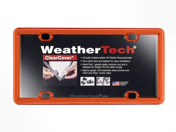 The WeatherTech® ClearCover® license plate cover is made from the virtually indestructible Eastman DuraStar™ polymer. Its one piece lens and gasket design allows for easy installation. The Multi-Flex™ gasket seals moisture out, and a stepped lip design fits the license plate snugly. Marine grade 18-8 stainless steel screws and Click and Stay® screw caps are included. WeatherTech® ClearCovers® have many styles to choose from, and will complement any vehicle. Virtually indestructible clear acrylic lens protects your plate. Flexible gasket helps prevent moisture and dirt penetration. UV protection helps prevent yellowing and cracking. 1 piece lens and gasket for easy installation. Stepped lip design to fit license plate snugly. Click and Stay® screw caps. Stainless Steel hardware kit included to fit most vehicle applications. Virtually indestructible. 1 ClearCover® per order.Please check state and local laws prior to use. WeatherTech® ClearCover® are guaranteed against faulty materials and workmanship for a period of three years.