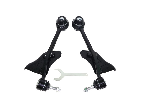 Complete replacement control arms featuring offset bushings that are primarily designed to improve traction and cornering grip under power. Increasing static caster to both front wheels. The special low compliance bushings reduce caster wind-back and maintain tighter tolerances between static and dynamic alignment settings. The additional caster coupled with the firmer bushings serve to dramatically sharpen initial turn-in response - forcing more consistent alignment angles through the corner due to the reduced bush compliance.