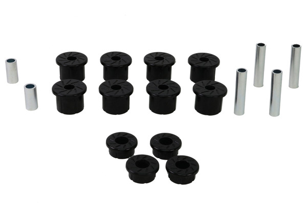 A critical service item for any leaf sprung vehicle. High kilometers and heavy load carrying causes excessive wear on rubber bushings. Whiteline's signature red bushings are made tough and offer outstanding abrasion resistance, high load bearing capability (4WD?s, utes and towing), flexibility, increased tensile strength and chemical resistance to oil, grease, ozone and weathering.